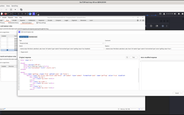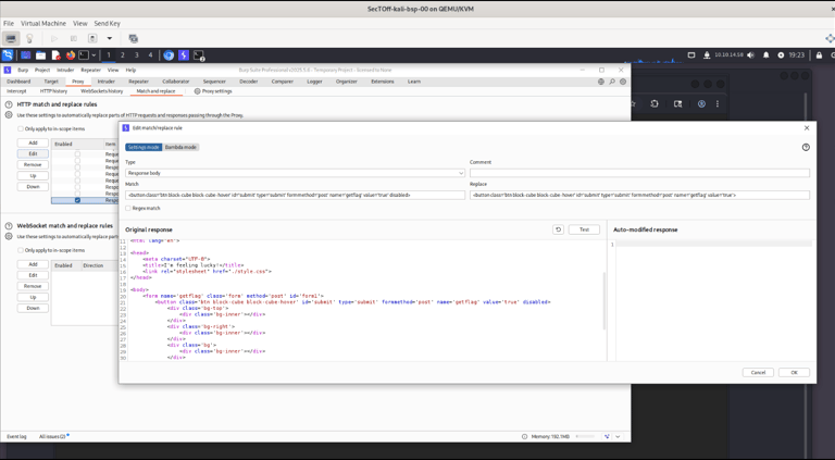 (Using Burp Suite Pro match/replace rule to intercept a response and auto modify a button element – running on Incus server node 1 (QEMU/KVM) – HTB Academy BBH module Assessment)