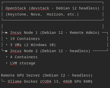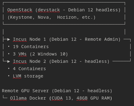 TL;DR – After diving into a handful of Scotti-BYTE’s YouTube tutorials and the official docs, I replaced my VMware stack with Incus (the fork of LXD) and OpenStack. I set up two Incus servers, on one server I spun up 19 containers + 3 VMs, and on the second 4 lightweight containers. The highlight? A Flask AI micro-service that talks to an Ollama model on a remote GPU-powered machine. Below is a step-by-step walk-through of what I watched, what I learned, and what I built.