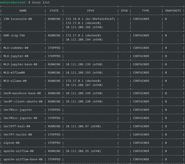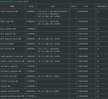 I built out two Incus server and one OpenStack server. I’ll be doing a separate blog on my OpenStack build out. The first Incus server lets call it node 1, has a total of 19 containers and 3 VMs. The second server has only 4 containers thus far.